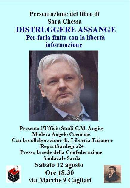 Nuova presentazione in Sardegna del libro “Distruggere Assange. Per farla finita con la libertà di informazione” di Sara Chessa che si svolgerà sabato 12 agosto alle ore 18:30 in via Marche 9 a Cagliari.