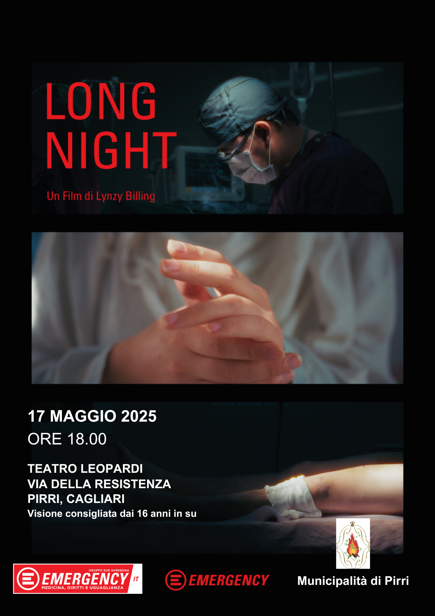 Appuntamento il 17 maggio 2025 alle h 18.00 al Teatro Leopardi, in Via della Resistenza a Pirri, Cagliari, per il documentario “Long Night” di Lynzy Billing, un’opera per raccontare l’impegno di Emergency in Afghanistan attraverso le testimonianze dei membri dello staff e dei loro pazienti. La serata si aprirà con i saluti di Maria Laura Manca, presidente della Municipalità di Pirri, che ha sostenuto l’iniziativa. A seguire, la presentazione di Gloria Corda, volontaria Emergency , l’intervento in collegamento di un/a operatore/operatrice Emergency , e il video saluto della regista Lynzy Billing. Dopo la proiezione del documentario, si terrà una tavola rotonda, introdotta da Maria Laura Manca, con riflessioni su azioni propositive a favore di interventi per la pace e la collaborazione tra i popoli assieme agli ospiti Andrea Frailis, giornalista ed ex parlamentare, Genet Woldu Keflay, presidente di Anolf Sardegna Odv, e Davide Carta, consigliere del Comune di Cagliari.