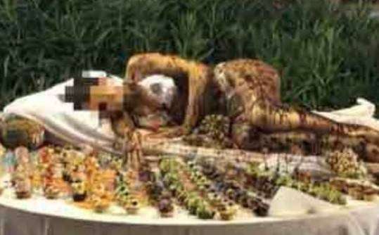 Una donna ricoperta di cioccolato su un vassoio di pasticcini ed è subito polemica.