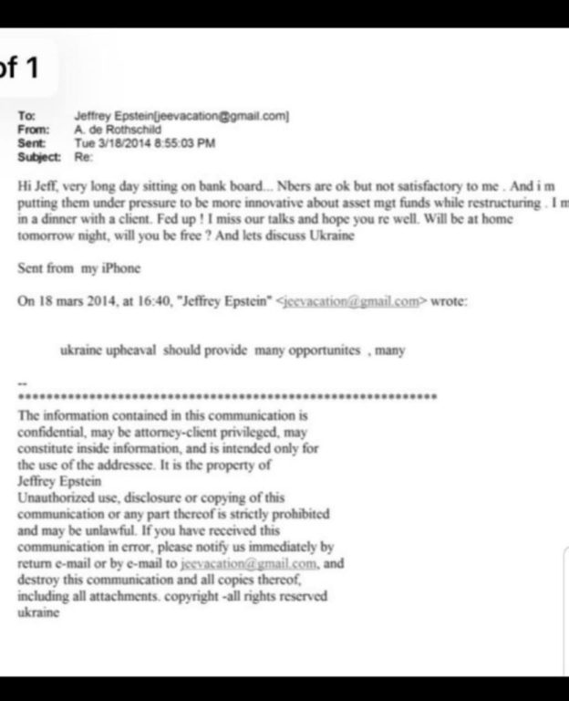 Rothschild: “Ciao Jeff, è stata una giornata lunghissima nel consiglio di amministrazione di una banca… I numeri vanno bene, ma non mi soddisfano. E li sto mettendo sotto pressione perché siano più innovativi sui fondi di gestione patrimoniale durante la ristrutturazione. Sono a cena con un cliente. Sono stufa! Mi mancano le nostre chiacchierate e spero che tu stia bene. Domani sera sarò a casa, sarai libero? E parliamo dell’Ucraina”