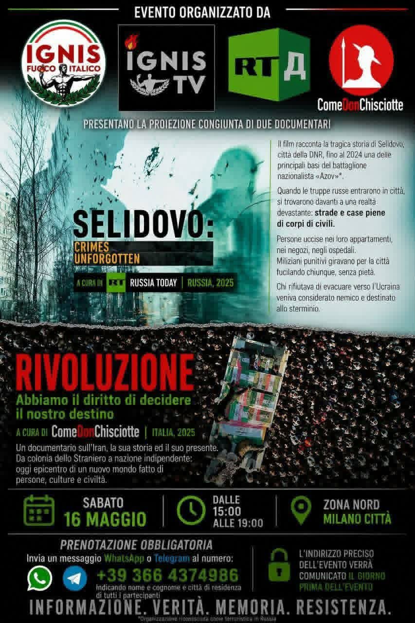Verrà proiettato il documentario “Rivoluzione” a cura di ComeDonChichotte e il documentario di RT “Selidovo, un crimine senza prescrizione”.