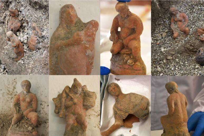 Le piccole sculture di circa 15 centimetri di altezza – come riportato nell’E-journal degli scavi di Pompei http://pompeiisites.org/e-journal-degli-scavi-di-pompei/ – tra cui si riconoscono figure umane, ma anche una noce, una mandorla, la testa di un gallo in argilla e una pigna in vetro sono state rinvenute in posizione eretta su un piano orizzontale all’interno di un vano dove probabilmente si trovava uno scaffale. Le sculture sono emerse dal lapillo ad un’altezza superiore ai 2 metri rispetto al piano pavimentale.