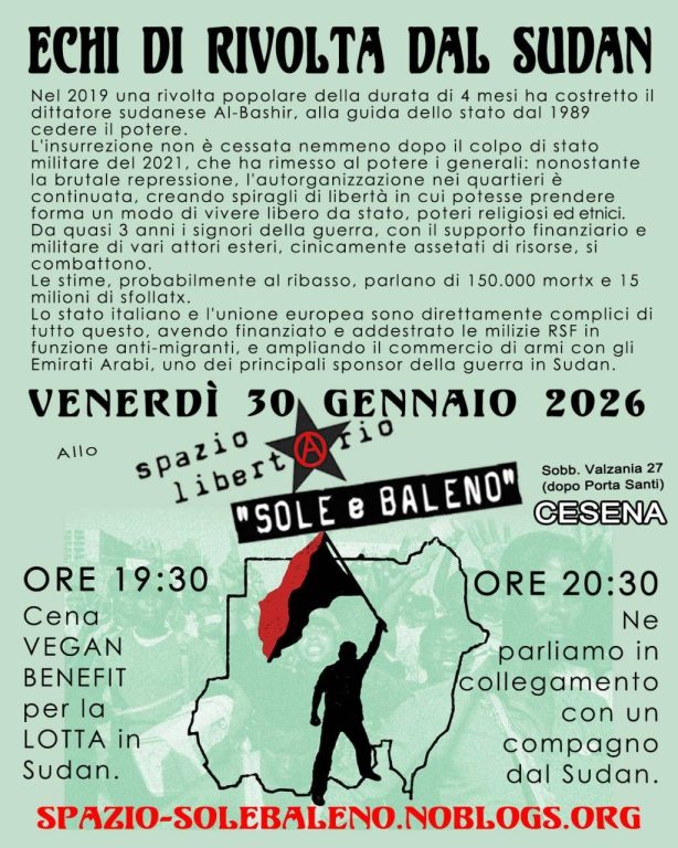 - Ore 20:30 – ECHI DAL SUDAN IN LOTTA. In collegamento con un compagno dal Sudan.