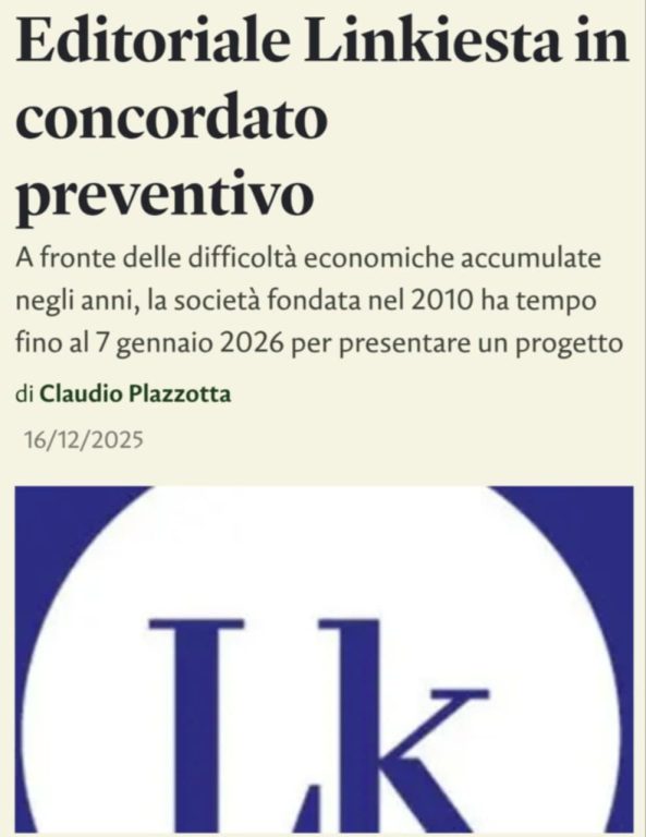 L’Editoriale Linkiesta è stata ammessa a procedura di concordato preventivo dal Tribunale di Milano. La società avrà tempo fino al 7 gennaio 2026 per presentare un progetto definitivo di concordato preventivo e provare a uscire dalle secche nelle quali, di fatto, si trova sin dalla sua fondazione nel 2010.