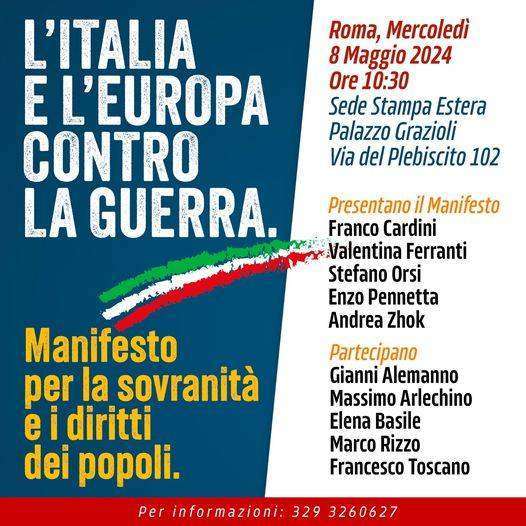 Un manifesto per la pace e contro l’unipolarismo, lo chiama così la cordata di sovranisti capitanata da Franco Cardini che presenterà il Manifesto per la sovranità e i diritti dei popoli “L’Italia e l’Europa contro la guerra” il prossimo mercoledì 8 maggio a Roma.