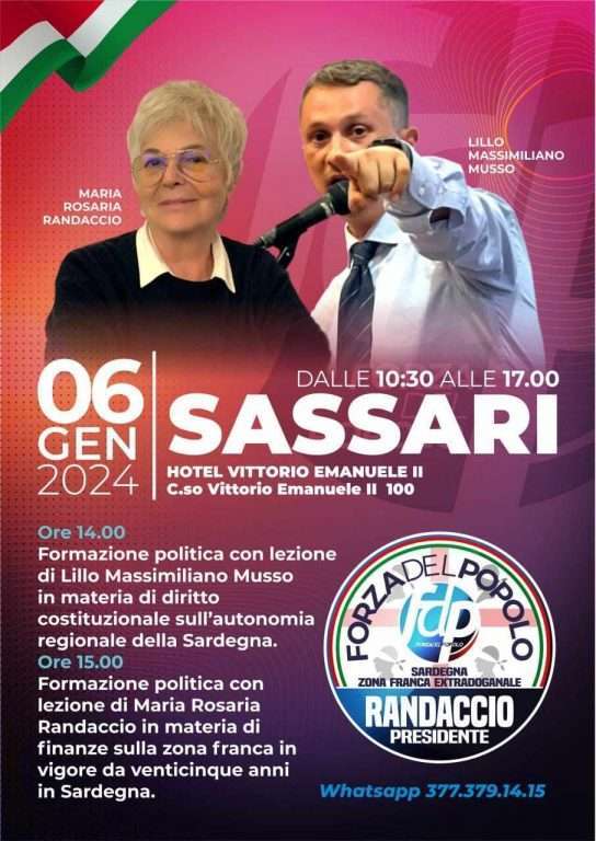 In vista delle elezioni regionali del 25 febbraio 2024, arriva in Sardegna, Lillo Massimiliano Musso, Segretario generale di Forza del Popolo, che sarà in Sardegna dal 5 al 7 gennaio per promuovere la raccolta firme in sostegno a Maria Rosaria Randaccio.