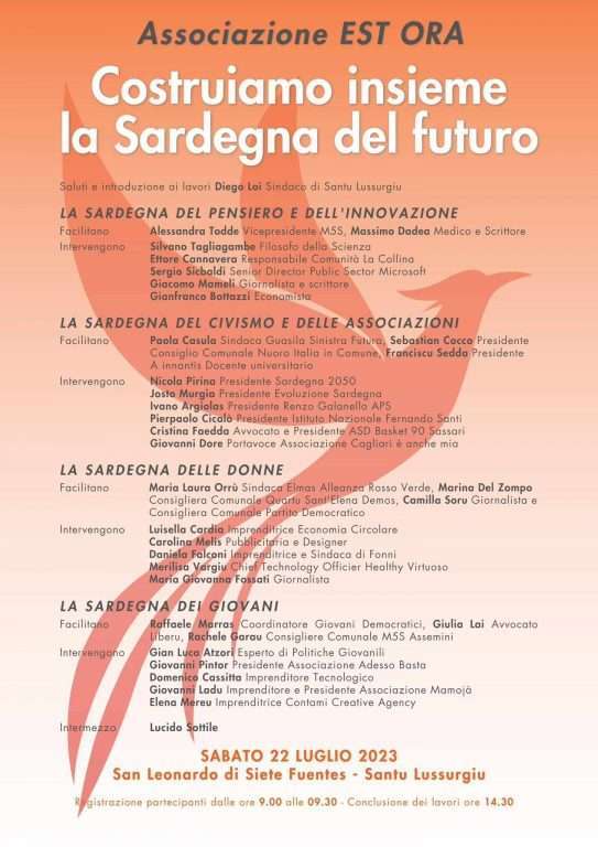 “La nostra isola merita un futuro che le restituisca dignità e prosperità. Questo obiettivo è un diritto per i sardi e un dovere per chiunque li rappresenti nelle istituzioni. Quello di sabato 22 è il primo di una serie di eventi che l’associazione nuorese Est Ora organizzerà in tutta la Sardegna, cercando di coinvolgere e unire le persone che hanno a cuore il presente e il futuro della nostra isola. E sono contenta di promuovere questo tipo di eventi perché ne condivido in pieno le finalità. L’obiettivo è uscire dalla palude del disinteresse per il futuro della Sardegna e stimolare il confronto su temi che consideriamo strategici per far progredire e prosperare la nostra isola, facilitando il dialogo tra la politica, le imprese e la società civile, quella di tutti i cittadini, nessuno escluso. Innovazione, sanità, trasporti, lavoro, infrastrutture, ambiente e sostenibilità sono parole chiave e rappresentano temi che non possono più essere trascurati o mal gestiti. L’entusiasmo non manca e di certo non mancano le idee ed è il momento di canalizzarle e trasformarle in azioni concrete. Est ora”, conclude la nota di Alessandra Todde.