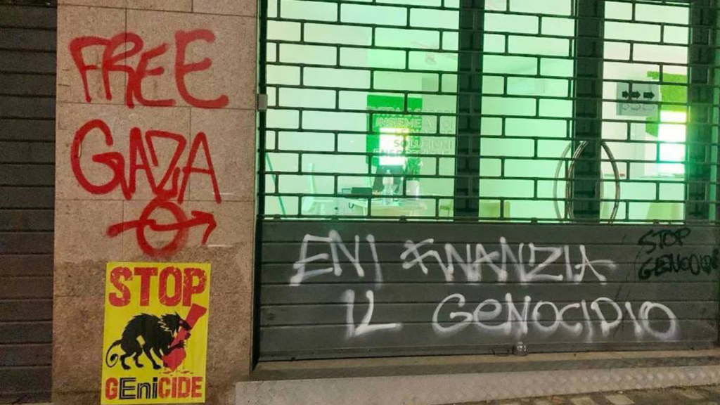 “Stop al genocidio”, “Eni complice”, “Eni finanzia il genocidio”. Queste sono solo alcune delle scritte apparse nei giorni scorsi a Roma, nei pressi dei punti vendita e sulle macchine di proprietà di Eni S.p.A. Di fianco alle scritte è stato appeso un manifesto in cui gli anonimi attivisti per la Palestina spiegano le loro motivazioni: “Eni S.p.A. – società controllata dallo Stato italiano – effettuerà per conto di Israele l’esplorazione dei giacimenti di gas nel mare di Gaza”, scrivono gli attivisti, facendo riferimento alle concessioni rilasciate dal ministero dell’energia israeliano a Eni e ad altri colossi mondiali dell’energia, per esplorare ed estrarre gas dalle acque che rientrano nella Zona Economica Esclusiva (ZEE) palestinese così come tracciata nella dichiarazione del 2019, e in conformità con le disposizioni della Convenzione delle Nazioni Unite sul Diritto del Mare, firmata dalla Palestina nel 2015. “L’appropriazione delle risorse naturali ed energetiche palestinesi, mentre l’aggressione su Gaza continua senza tregua”, continua il comunicato, “rende l’Italia attivamente complice nel genocidio in corso”.