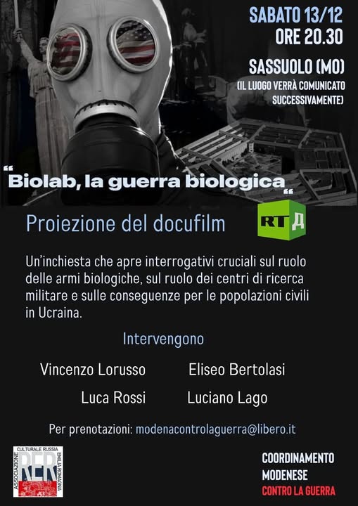 L’evento prevede la proiezione di un docufilm prodotto da Russia Today (RT) e l’associazione Europa Radicale, i cui responsabili non hanno un cazzo da fare, ha inviato email pec a Prefetto, Questore e Sindaco di Sassuolo per cercare di impedire la libera informazione, la libertà di opinione, il tutto con la ridicola scusa del divieto di proiettare i documentari di Rt.