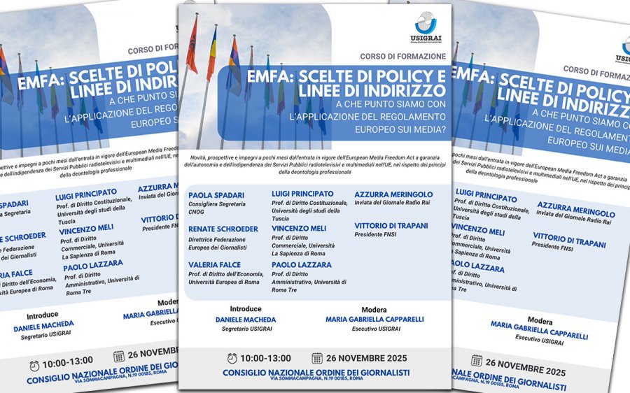 ‘Emfa: scelte di policy e linee di indirizzo. A che punto siamo con l’applicazione del Regolamento europeo sui media?’: è questo il titolo del corso di formazione, organizzato da Usigrai, che si svolgerà mercoledì 26 novembre 2025 dalle ore 10:00 alle 13:00 nella sede del Consiglio nazionale dell’Ordine dei giornalisti in via Sommacampagna19 a Roma.