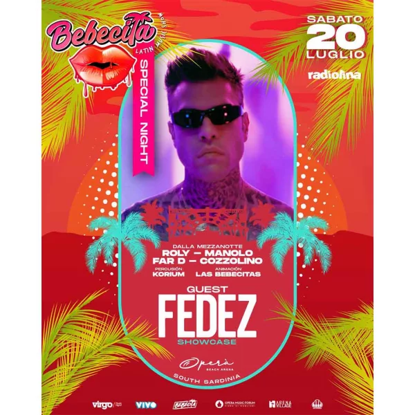 Il 20 Luglio il suo showcase sbarca sul Palco dell’ Opera Beach Arena all’interno di un evento che vedrà protagonisti anche lo Show Latino di Bebecita con i Dj Roly, Cozzolino e Far D, la batteria di Korum e le Danze del Las Bebecitas. L’evento prodotto da Tra Le Nuvole inizierà alle ore 23:00 e andrà avanti tutta la notte. Sono in vendita da oggi 26 Giugno 2024 su www.operabeach.com e il circuito Box Office Sardegna i biglietti per lo show a partire da 26 euro più DP