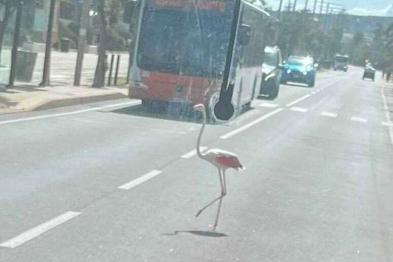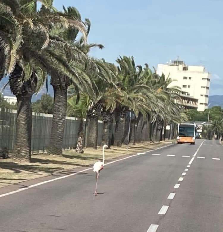 Un fenicottero rosa ha bloccato per un momento il traffico delle auto, compreso un bus di linea, per attraversare la strada davanti alla spiaggia del Poetto a Cagliari e poi passeggiare in spiaggia