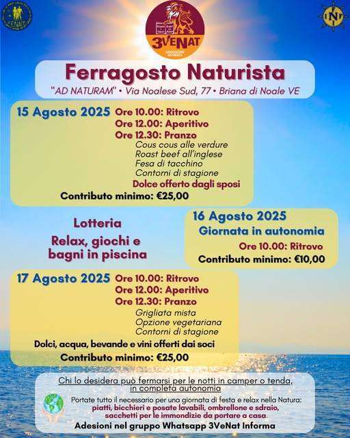 Il Ferragosto Naturista 3VeNat si terrà presso il giardino “Ad Naturam” dal 15 al 17 agosto in via Noalese Sud 77 a Briana di Noale (VE).