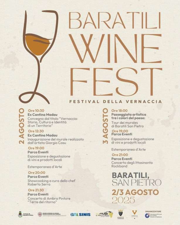 Il festival prenderà il via sabato 2 agosto alle ore 10:30 presso l’Ex Cantina Madau con il convegno “Vernaccia: Storia, Cultura e Identità di un Territorio”, un momento di approfondimento dedicato alle radici storiche e culturali della Vernaccia di Oristano, primo vino sardo a ottenere la denominazione DOC nel 1971 e autentico simbolo del territorio di Baratili San Pietro.