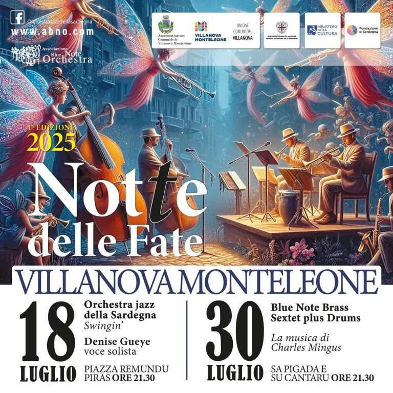 “Not(t)e delle Fate” è questo il suggestivo nome del nuovo festival che l’amministrazione Comunale di Villanova Monteleone ha affidato all’organismo più importante della Sardegna, e tra i più importanti in Italia, per quanto riguarda la produzione di musica jazz, l’Associazione Blue Note Orchestra/Orchestra Jazz della Sardegna. Il festival, che si svolgerà a Villanova Monteleone nel corso di due serate, gode anche del contributo della Regione Sardegna, del MIC e della Fondazione di Sardegna.