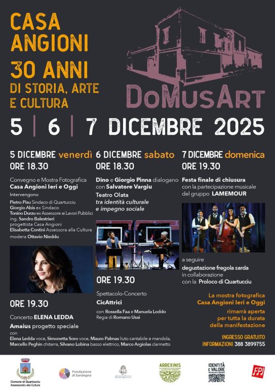 “Casa Angioni, 30 anni di storia, arte e cultura” è il titolo della manifestazione che venerdì 5 a domenica (7 dicembre), andrà in scena nella “domus” campidanese in via Neghelli: una tre giorni di incontri e spettacoli in quello che è uno dei principali poli culturali della città, unendo la memoria storica dell’architettura campidanese con la vitalità degli eventi contemporanei; uno spazio che ha visto e vede passare tanti artisti sia della scena locale nazionale che internazionali, eventi culturali, di tradizione e folcloristici; un esempio di come il patrimonio edilizio tradizionale possa essere recuperato e valorizzato per la comunità.