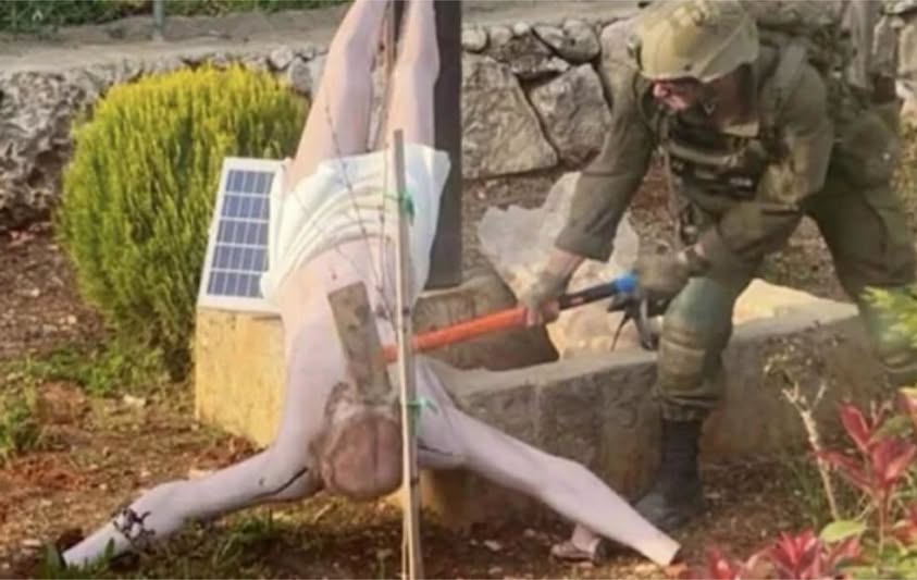 Un soldato israeliano è stato ripreso mentre colpisce con una mazza una statua di Gesù crocifisso caduta dalla croce.