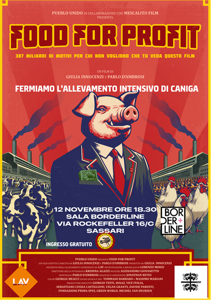 Mercoledì 12 novembre ore 18.30 presso la sala Borderline+ in collaborazione col MOS (movimento omosessuale sardo) in via Rockefeller 16/c a Sassari, Lav è lieta di annunciare la proiezione con ingresso gratuito del docu-film di Giulia Innocenzi e prodotto da Lav intitolato “Food for Profit” che ha riscosso e sta riscuotendo grandissimo interesse con milioni di spettatori in Italia, in tutta europa ed ora anche in altri continenti.