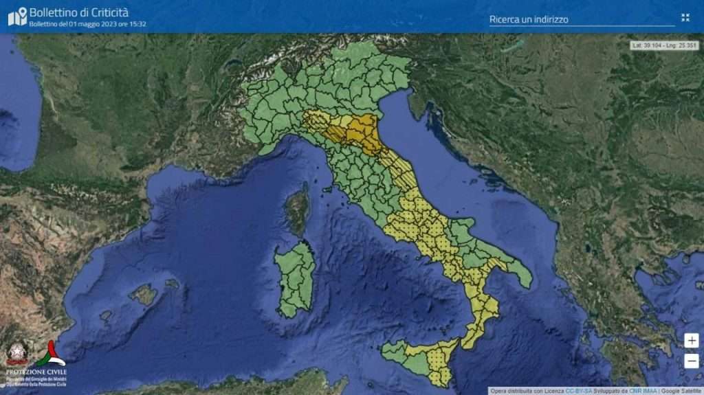 Sulla base dei fenomeni previsti e in atto è stata valutata per la giornata di domani, martedì 2 maggio, allerta arancione su gran parte dell’Emilia-Romagna, allerta gialla sui restanti settori dell’Emilia-Romagna, sulle Marche, Abruzzo, Molise, Campania e Calabria, sul Lazio meridionale e su parte di Basilicata, Puglia e Sicilia.