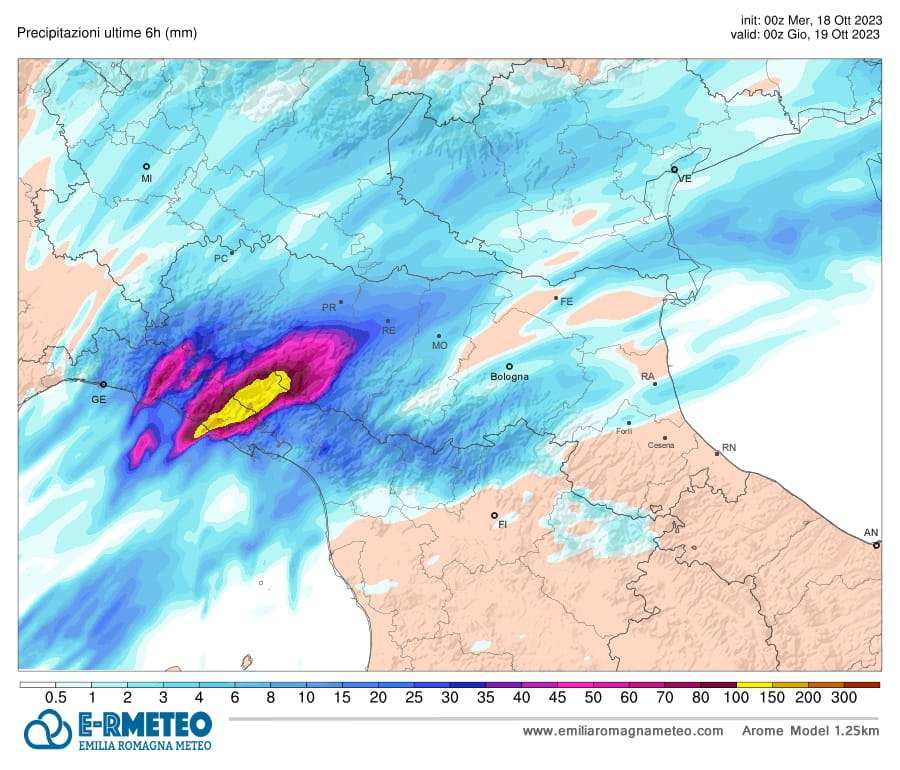 In caso di fenomeni stazionari non si escludono picchi di 200/250 mm tra Crinale Occidentale e Liguria.