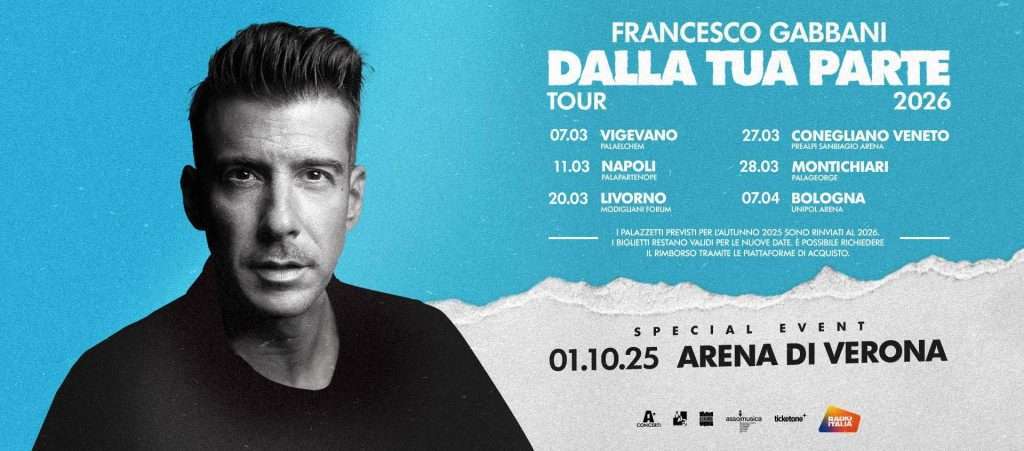 Francesco Gabbani ha rinviato la seconda parte del suo tour nei palazzetti, inizialmente prevista per novembre e dicembre 2025: le nuove date saranno a marzo e aprile 2026.
