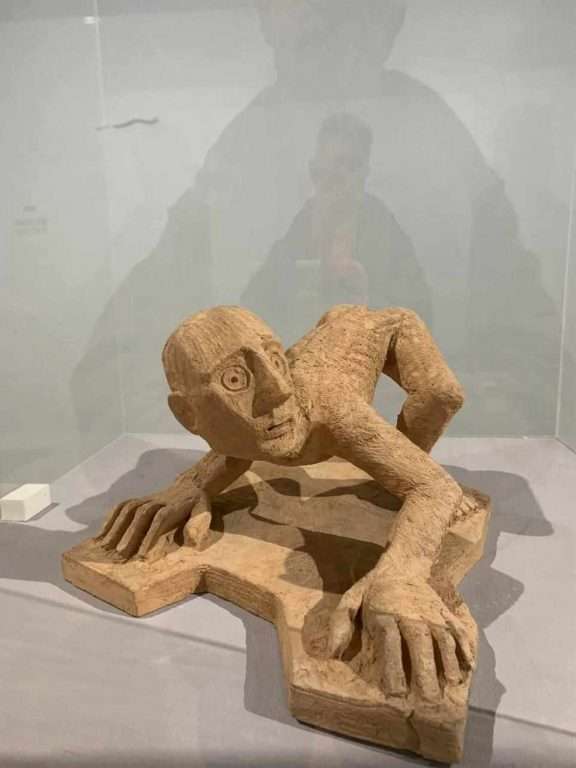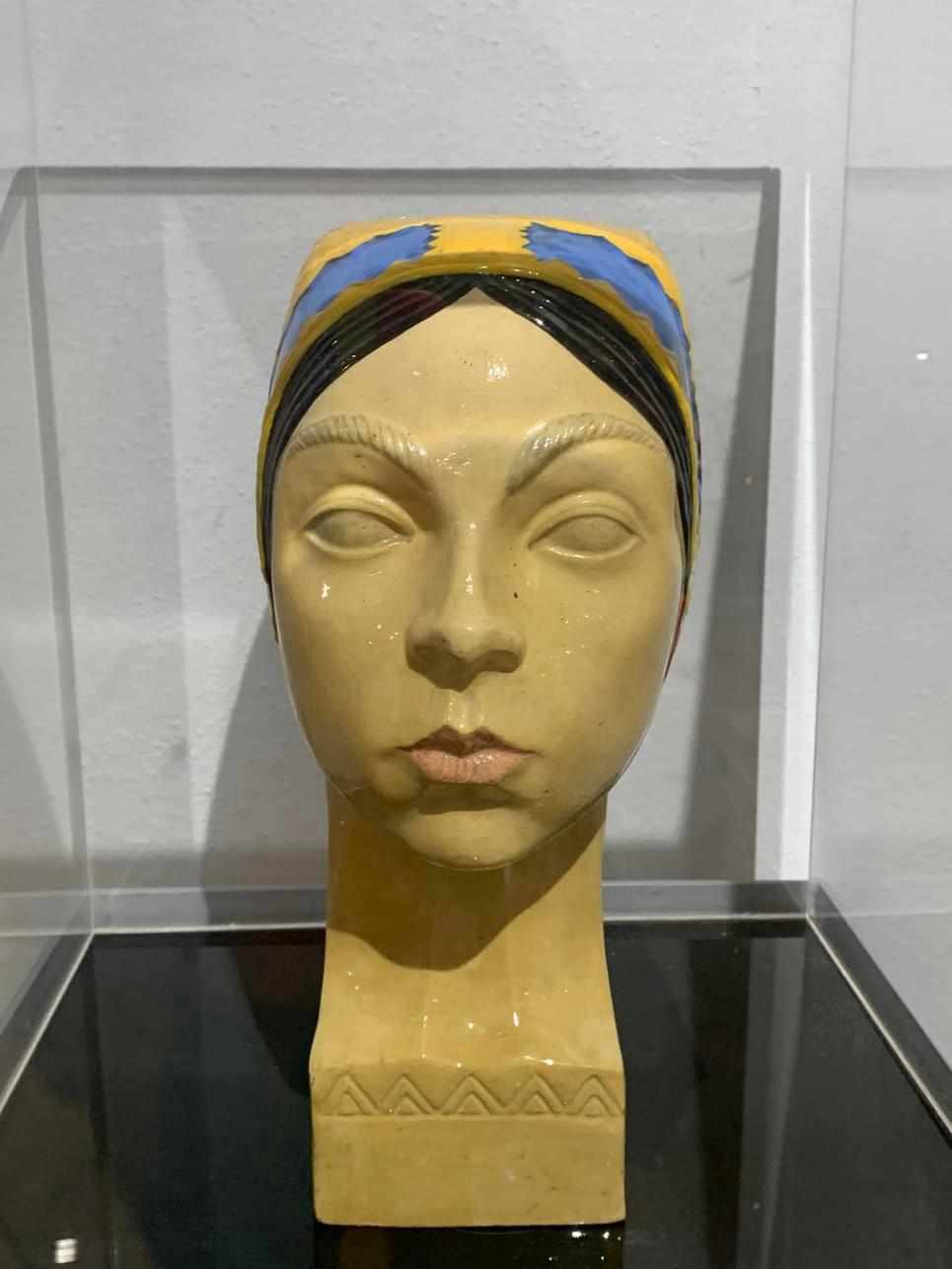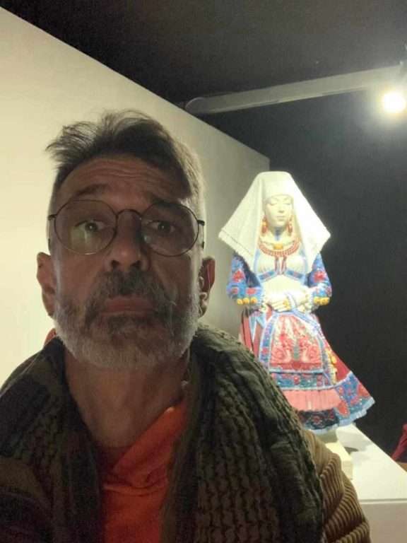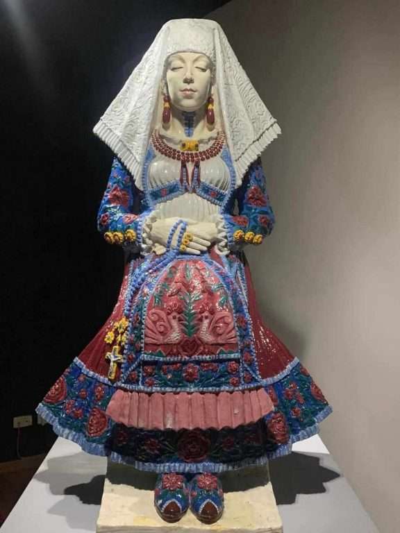 Hanno anime diverse i fratelli Melis, le ceramiche di Federico Melis sono fortemente identitarie, spettacolare è “L’agguato”, opera in Terracotta che ben figurerebbe nel Museo Archeologico di Cagliari, c’è un bronzetto che pare un gigante di Monti Prama, che si muove spaventato a carponi, quasi a sottintendere di sapere che qualcuno lo voglia abbattere (o scoprire?), l’opera è impressionante a maggior ragione, perché precede di dieci anni il ritrovamento della testa del gigante, sublimi e fuori dal tempo le sue ragazze desulesi, volti che mi pare d’avere sempre incrociato nei miei percorsi isolani; “La sposa antica” è il capolavoro, pezzo nella collezione dell’Università degli Studi di Cagliari, che in un’altra realtà meriterebbe la galleria dell’Accademia (che a Cagliari non è ancora mai stata), un vero virtuosismo ceramico, una cottura di un pezzo di un metro d’altezza, non a caso il Professore Giorgio Pellegrini, la paragona a un pezzo di Jeff Koons, che del marketing dell’arte come mestiere ha tracciato e definito a colpi di mass media il suo profilo artistico.