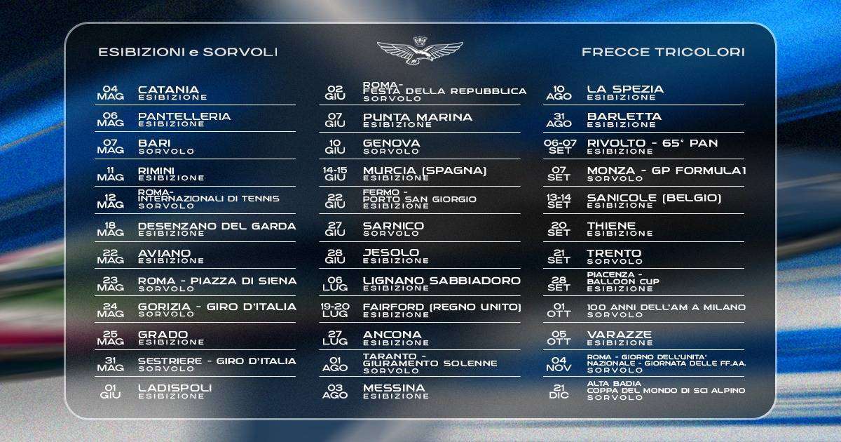 Come ogni anno, anche nel 2025 le Frecce tricolori sorvoleranno l’Italia con le loro acrobazie in diversi appuntamenti e date in giro per il Paese, tra esibizioni e semplici sorvoli. Il calendario con le date delle manifestazioni aeree delle Frecce Tricolori 2025 infatti è ricco di appuntamenti e quest’anno culminerà con la due giorni di esibizioni a Rivolto per il 65esimo anniversario delle Fecce Tricolori.