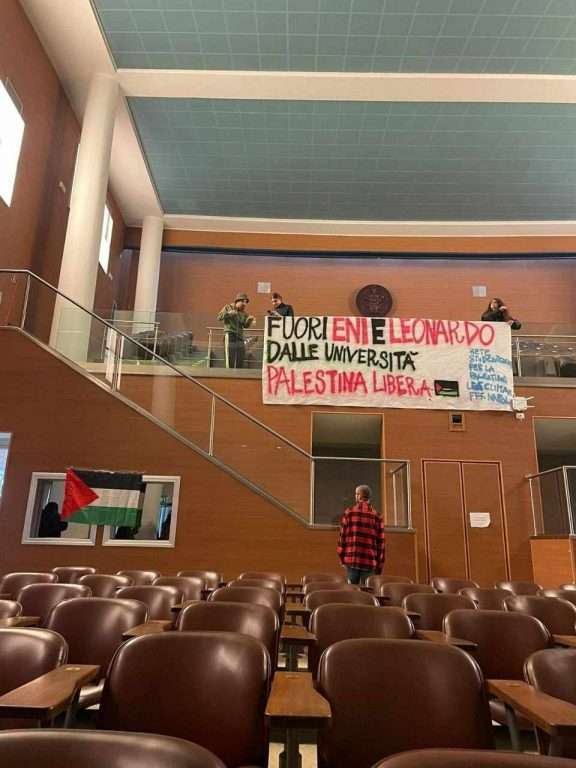 “Farebbe ridere, se non facesse piangere: una delle “7 sorelle” – così vengono chiamate le 7 multinazionale del fossile più ricche ed al tempo stesso più inquinanti al mondo – non può di certo presentarsi come sostenibile agli occhi delle comunità studentesche”, la pensano così anche a Napoli, dove attivist3 di Fridays Forfuture Napoli e Lea Climax insieme alla Rete Studentesca Palestina Napoli hanno bloccato l’aula dove il convegno targato cane a sei zampe si sarebbe dovuto tenere, organizzando una contro-conferenza per riappropriarsi dei saperi ancora troppo “inquinati” dai combustibili fossili.