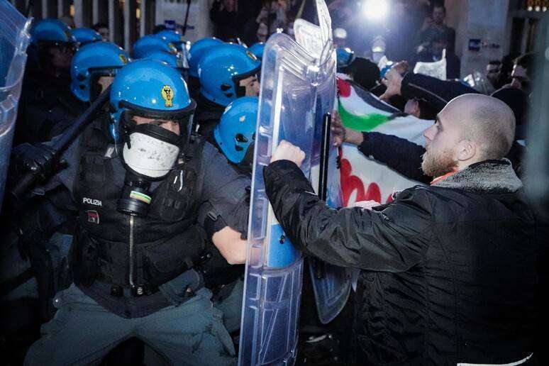 La polizia ha usato prima gli scudi per respingere i manifestanti poi ha fatto ricorso a idranti e lacrimogeni, infine anche a qualche manganellata.