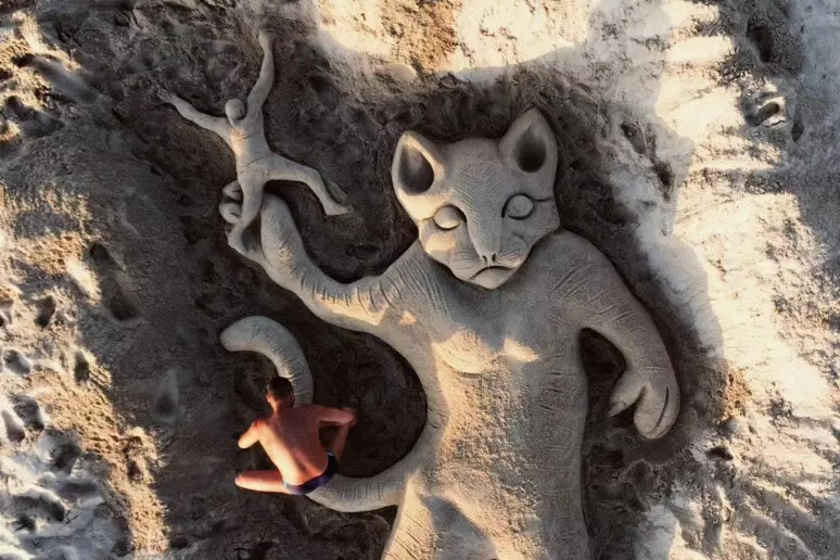 Si tratta di una enorme scultura di sabbia realizzata da Nicola Urru, non nuovo a queste installazioni temporanee sul litorale, sulla spiaggia di Platamona a Sassari, esattamente all’altezza del quinto pettine.