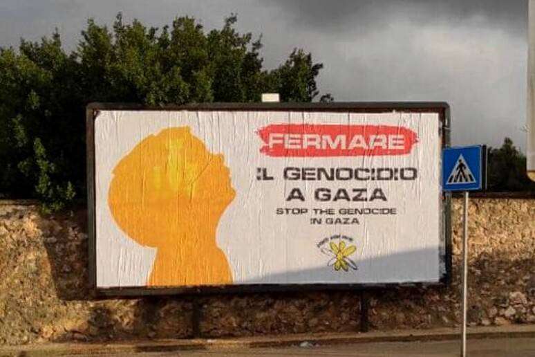 In via Luna e Sole l’associazione ‘Ponte non muri’ ha comprato uno spazio pubblicitario e ha fatto affiggere un manifesto sei metri per tre con la scritta: “Fermare il genocidio a Gaza”.