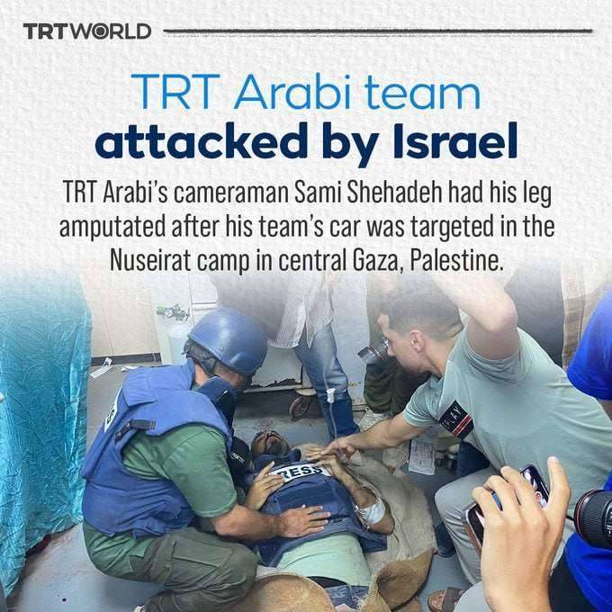 Il cameraman di TRT Arabi, Sami Shehadeh, ha avuto la gamba amputata dopo che l’auto del suo team è stata colpita. Nell’attacco avvenuto oggi sono rimasti feriti diversi reporter della testata TRT che stavano raccontando gli attacchi di Gaza.