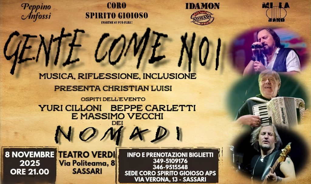Sabato 8 novembre alle 21 al Teatro Verdi di Sassari il Coro Spirito Gioioso presenta “Gente come Noi – Musica, Riflessione, Inclusione”, che già nel titolo riprende l’omonimo album dei Nomadi del 1991.