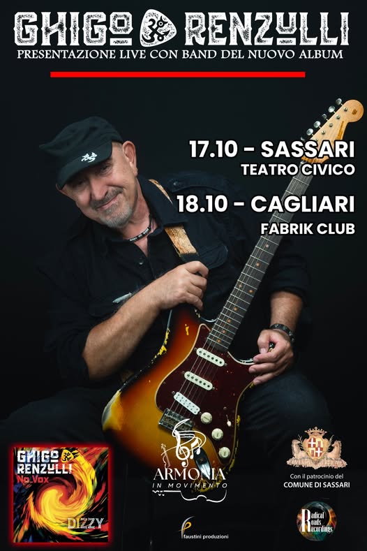 Prosegue il tour di presentazione di “Dizzy”, l’ultimo album di Ghigo Renzulli, uscito il 6 dicembre 2024. Dal 17 ottobre 2025 a Sassari Ghigo Renzulli proseguirà con il tour sul suo ultimo album “Dizzy”, una serie di concerti in giro per l’Italia. Il chitarrista e compositore, noto per la sua lunga carriera e per essere uno degli storici compositori della musica italiana, si esibirà dal vivo con la sua band.