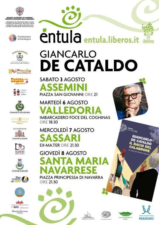 Giancarlo De Cataldo ospite di Éntula ad Assemini il 3 agosto, a Valledoria il 6, a Sassari il 7 e a Santa Maria Navarrese l’8