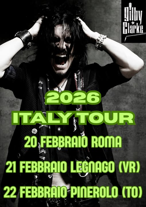 Gilby Clarke, leggendario cantante e chitarrista statunitense con un passato nei 𝐆𝐮𝐧𝐬 𝐍’ 𝐑𝐨𝐬𝐞𝐬 e un’ultratrentennale carriera solista, 𝐭𝐨𝐫𝐧𝐚 𝐢𝐧 𝐈𝐭𝐚𝐥𝐢𝐚 𝐚 𝐟𝐞𝐛𝐛𝐫𝐚𝐢𝐨 𝐩𝐞𝐫 𝐮𝐧 𝐦𝐢𝐧𝐢𝐭𝐨𝐮𝐫 𝐝𝐢 𝐭𝐫𝐞 𝐝𝐚𝐭𝐞 che prenderà avvio 𝐯𝐞𝐧𝐞𝐫𝐝𝐢̀ 𝟐𝟎 𝐟𝐞𝐛𝐛𝐫𝐚𝐢𝐨 𝟐𝟎𝟐𝟔 𝐚 𝐑𝐨𝐦𝐚.