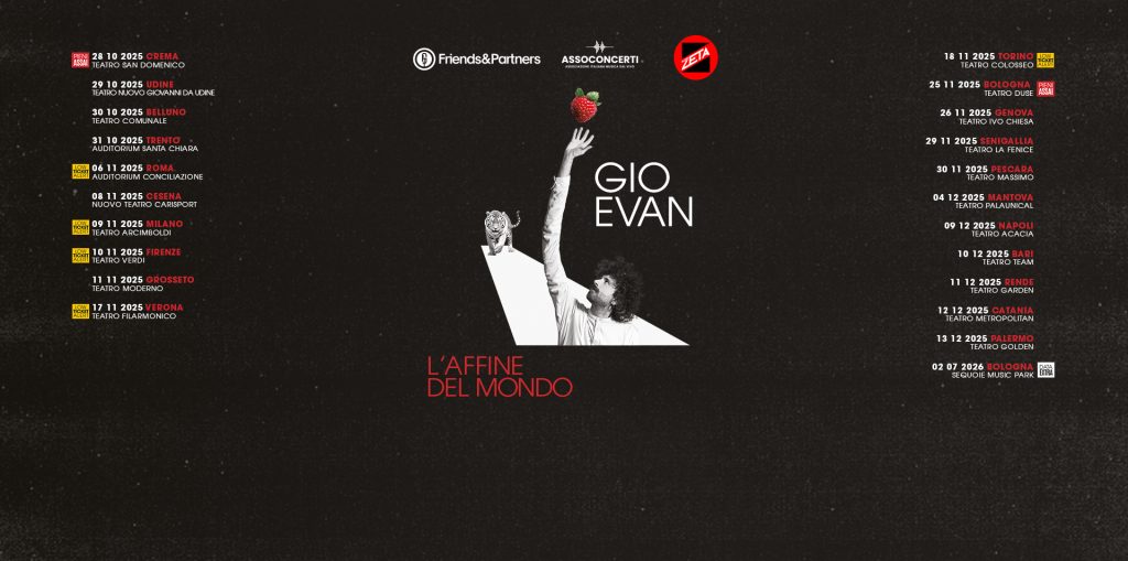 Dal 28 ottobre Gio Evan sarà impegnato con il suo nuovo tour teatrale, scritto e diretto da lui stesso e dal titolo L’affine del mondo. Lo spettacolo racconta la storia di un mondo costruito dall’affinità e dalla connessione tra esseri umani, mescolando poesia, fisica quantistica, musica e comicità per riflettere sull’importanza dell’ascolto e dell’armonia, proponendo un nuovo modo di concepire la vita e le relazioni.