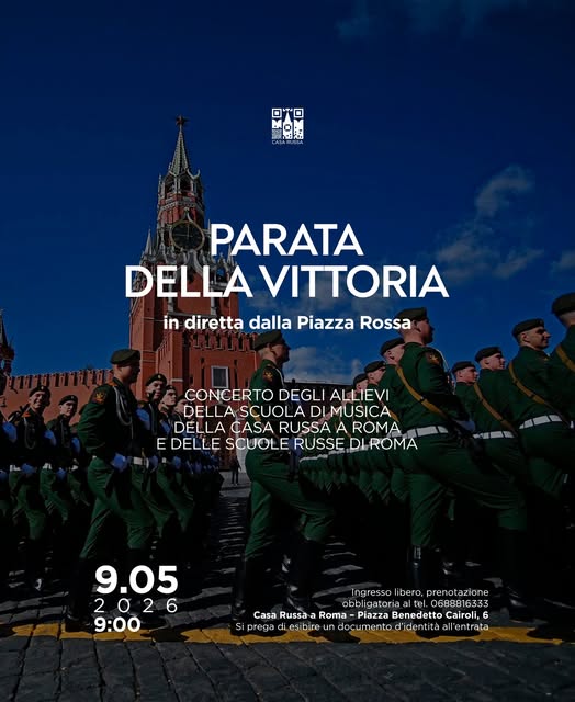 La Casa Russa a Roma a promosso un evento per la Giornata della Vittoria, infatti il 9 maggio alle ore 9:00, sarà trasmessa in diretta la Parata della Vittoria della Piazza Rossa nella sala della Casa Russa.