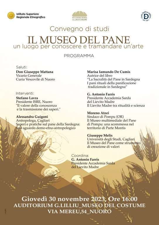 Giovedì 30 novembre 2023 alle ore 16, presso l’Auditorium G. Lilliu del Museo del Costume di Nuoro, si terrà il Convegno co-organizzato dall’Isre e dall’Accademia Sarda del Lievito Madre, “Il Museo del Pane. Un luogo per conoscere e tramandare un’arte.”