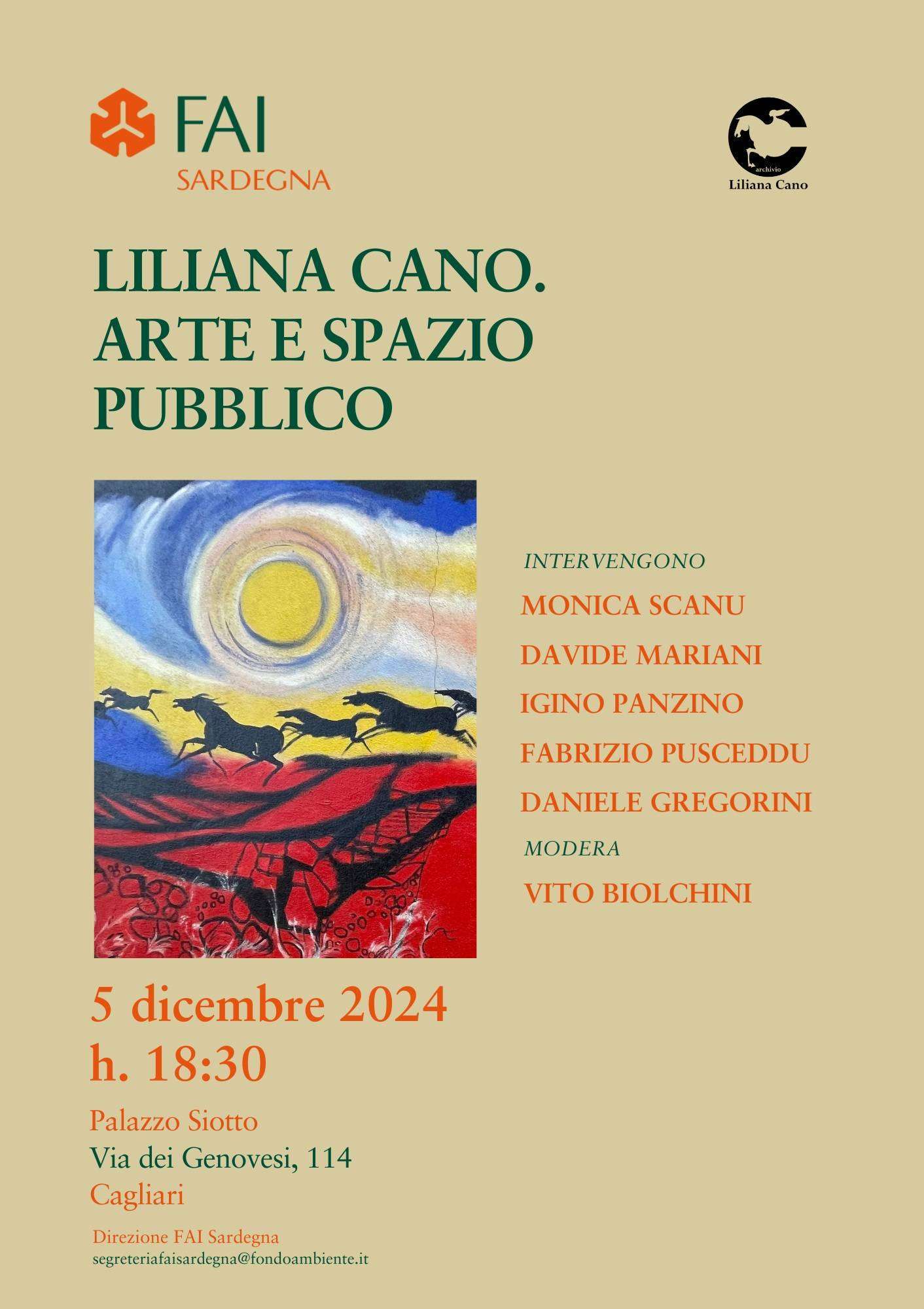 “Liliana Cano. Arte e spazio pubblico”, è il titolo della conferenza organizzata per giovedì 5 dicembre a Cagliari dal FAI Sardegna, in collaborazione con l’Archivio Liliana Cano, nella suggestiva cornice di Palazzo Siotto (Via dei Genovesi 114), con inizio alle ore 18.30.