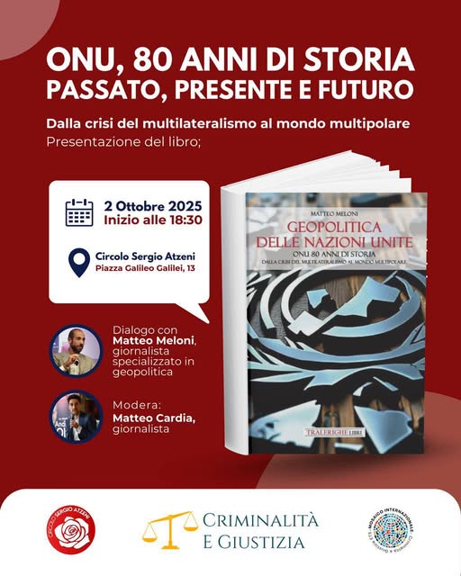 Giovedì 2 ottobre alle ore 18:30 nella sede del Circolo Sergio Atzeni, a Cagliari in piazza Galilei n. 13, si terrà la presentazione del libro “Geopolitica delle Nazioni Unite. ONU, 80 anni di storia. Dalla crisi del multilateralismo al mondo multipolare”.