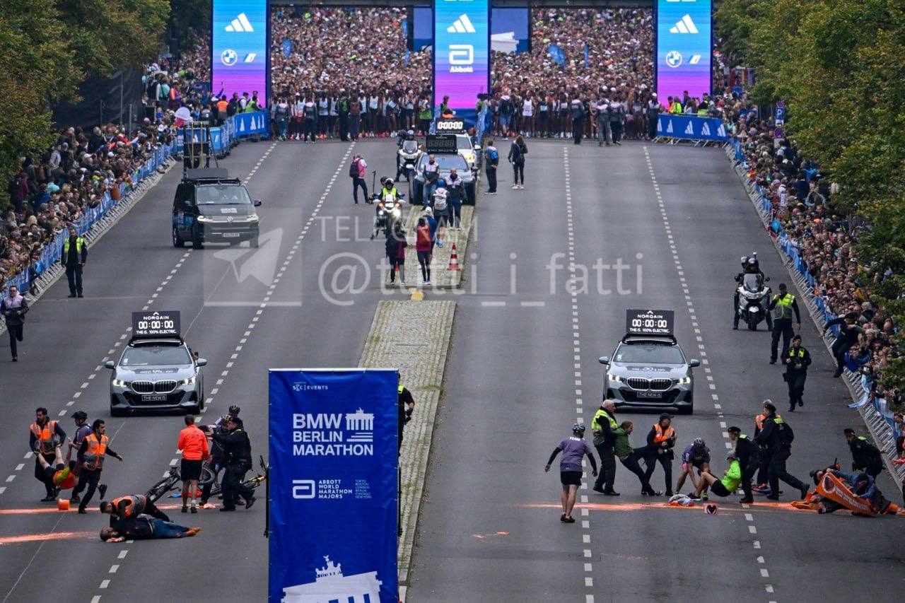 Gli eco-attivisti del movimento Last Generation oggi hanno cercato di sabotare la svolgimento della Maratona Internazionale di Berlino, versando vernice arancione sulla pista.