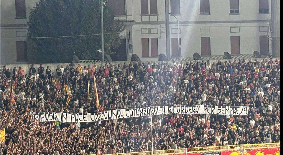 Gli Ultras del Catanzaro, durante la partita contro il Sassuolo, hanno esposto un mega striscione per ricordare lo storico ultras olbiese morto in un incidente stradale.