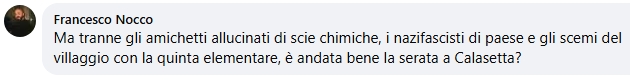 A margine dell’evento un commento molto grave è stato pubblicato da tal Francesco Nocco, noto “provocatore” filo ucraino, ha commentato l’evento svoltosi a Calasetta con questa vergognosa frase: “Ma tranne gli amichetti allucinati di scie chimiche, i nazifascisti di paese e gli scemi del villaggio con la quinta elementare, è andata bene la serata a Calasetta?”.