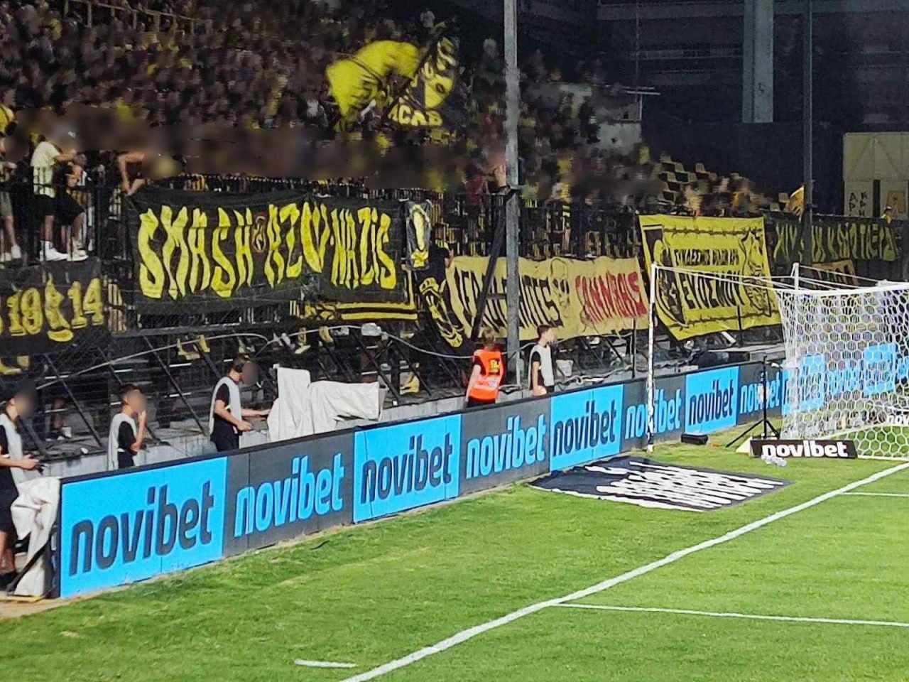 Lo striscione “Smash Azov Nazis” è stato esposto dalla curva dell’Aris Salonico durante la partita con la Dinamo Kiev.