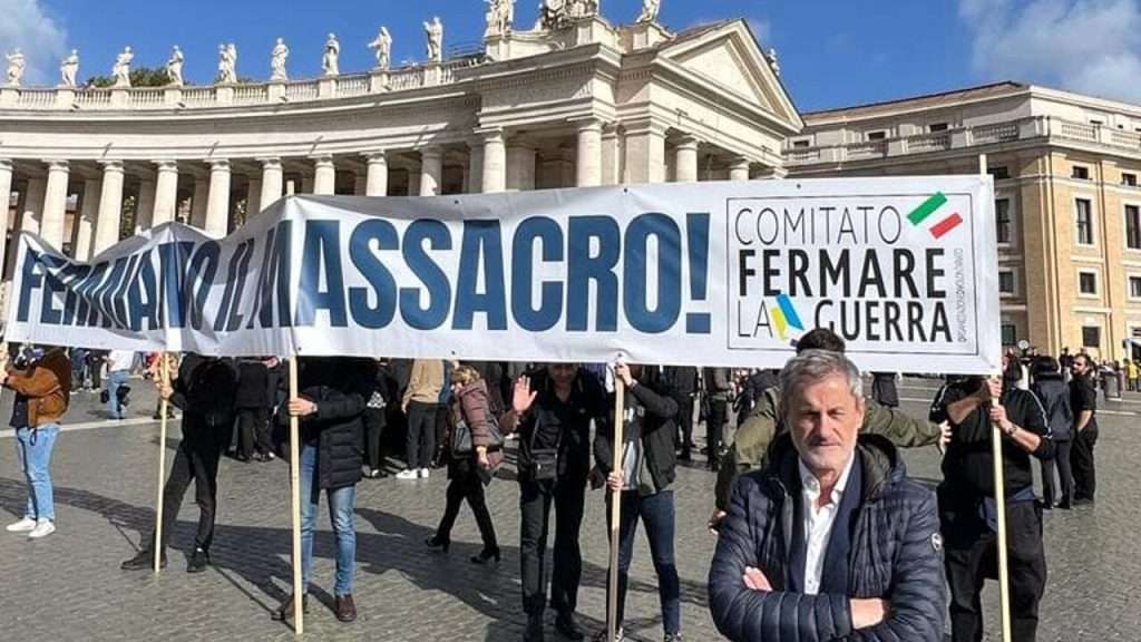 “Questa mattina all’Angelus di Papa Francesco abbiamo portato in Piazza San Pietro lo striscione “Fermare il massacro” firmato dal “Comitato Fermare la guerra ODV”. Il santo padre dopo un forte appello alla pace in Medio Oriente ci ha fatto l’onore di salutare, tra gli altri, i volontari del Comitato Fermare la guerra. Lo stesso gesto è stato ripetuto dai nostri volontari in tante Basiliche delle città italiane. Con questo gesto abbiamo voluto mostrare la nostra vicinanza a Papa Francesco che, sia per la guerra in Ucraina che per il conflitto in Palestina, è l’unico leader mondiale che si sta impegnando realmente per la Pace.