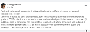 Dopo pochi minuti la durissima replica dell’avvocato Farris che lo chiama Paolino e poi aggiunge: “Il Lirico non è strumento di lotta politica bensì lo hai fatto diventare un luogo di occupazione politica” – parole durissime e senza precedenti nel centro destra cagliaritano – “Detto ciò, le bugie, da parte di un Sindaco, sono inaccettabili:1) le perdite sono state ripianate grazie al COVID. Infatti, non si andava in scena, ma i contributi pubblici arrivavano comunque. 2)il pubblico, dopo la pandemia, non è rientrato al Teatro. 3) nell’ ultimo anno, solo una seduta si è tenuta in orario pomeridiano. P. S.: Se insisti, posso provare documentalmente quello che sostengo. D’altro canto, è tutto nel sito della Fondazione”, conclude il post sui social Giuseppe Farris.