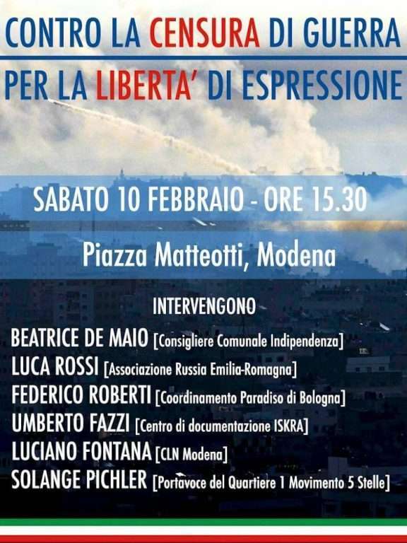 Sabato 10 febbraio dalle 15:30 in Piazza Matteotti, a Modena, si terrà un’iniziativa in cui si parlerà di libertà di espressione e del conflitto a Gaza e in Ucraina, organizzata da gruppi, associazioni e partiti che, pur di diversa estrazione politica e culturale sono concordi nel dire no ad ogni censura del libero pensiero.