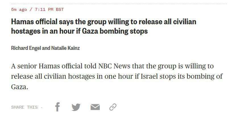 Un alto funzionario di Hamas ha dichiarato a NBC News che il gruppo è disposto a rilasciare tutti gli ostaggi civili entro un’ora se Israele interrompe i bombardamenti su Gaza.
