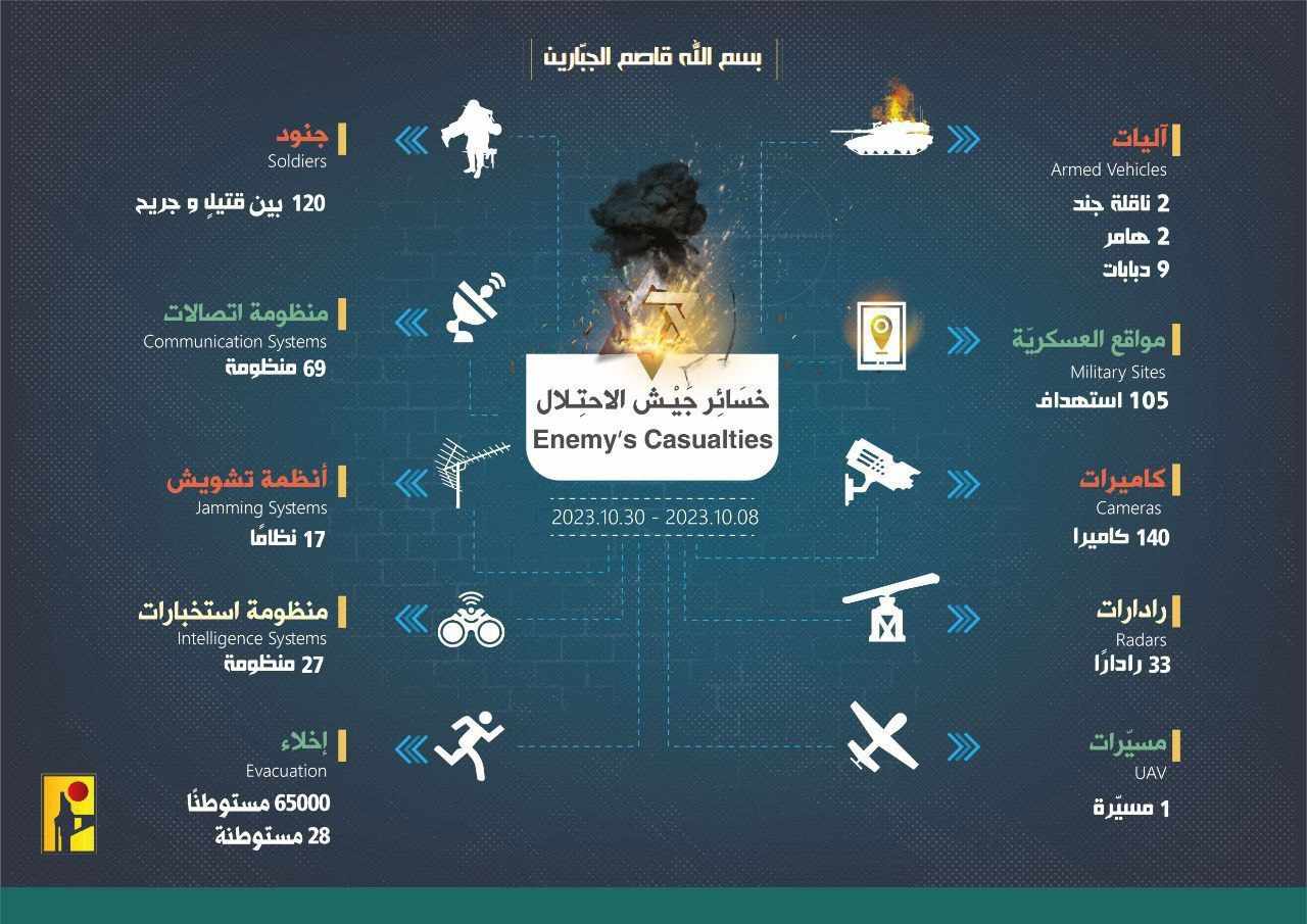 Il movimento di resistenza sciita libanese Hezbollah ha pubblicato un’infografica che mostra i danni causati al nemico israeliano al confine tra Libano e Palestina dall’8 al 30 ottobre durante le operazioni sulla via verso Al-Qods (Gerusalemme).